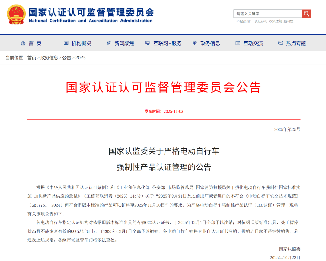 国家认监委关于严格电动自行车强制性产品认证管理的公告